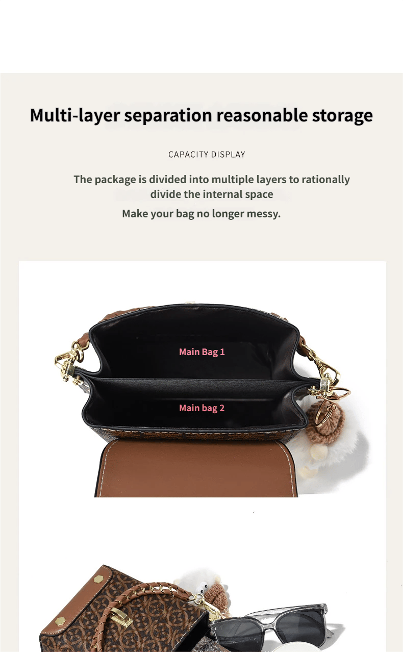 Despite its compact look, the interior features a multi-layer partition design. With two main compartments, it allows you to organize your essentialsâsuch as your phone, sunglasses, lipstick, and walletâneatly and efficiently. No more digging through a cluttered bag; everything has its dedicated place for easy access.